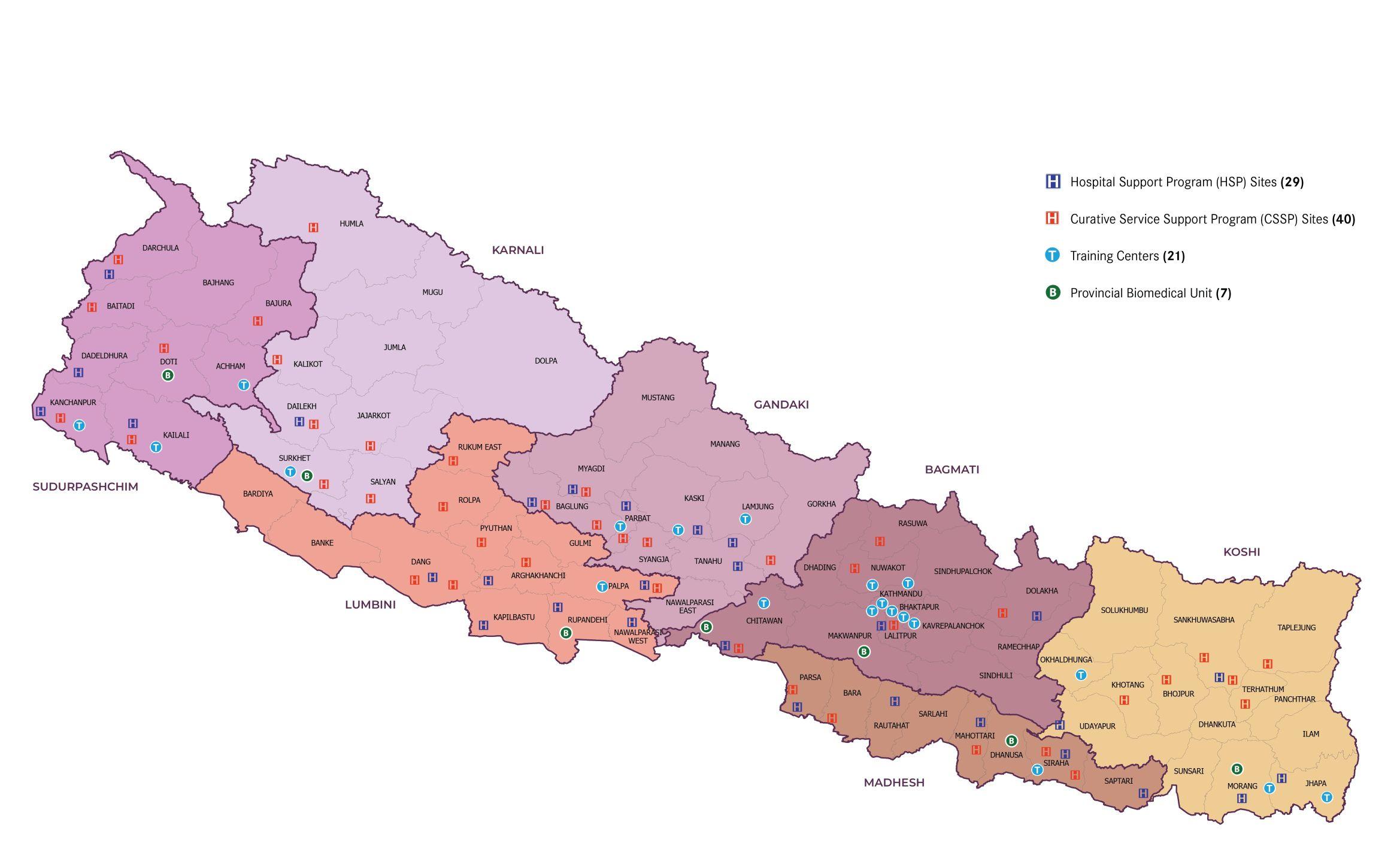 LEARN MOREThe CSSP is the continuation of the Rural Staff Support Program (RSSP) which was piloted in 2007 in 3 rural government hospitals of Nepal. This program supports the necessary human resources, medical equipment, and living support to the clinical team for those hospitals. The program has been implemented in 44 hospitals.